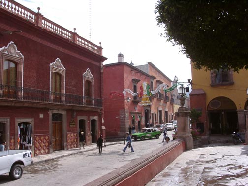 San Miguel de Allende is one of the oldest and prettiest of Mexico's colonial cities. Settled in 1542 by a Franciscan friar, it is located near the geographic center of Mexico, 180 miles NW of Mexico City. At an altitude of 6,300 feet, the town has a nearly flawless climate with sunny days and cool nights year around. It is dry much of the year but in summer, late afternoon rains turn the surrounding countryside into a lush green landscape. The city was declared a National Historic Monument in 1926. There are some steep streets and alleys, many of the sidewalks are exceedingly narrow, and many of the streets are paved with cobblestones. The pace is slow, the people are friendly, and the weather is incomparable. More pictures below. To see the full-size image, click the thumbnail image. First is the Parroquia (parish church), San Miguel's best- known landmark. Then three street scenes in San Miguel. |