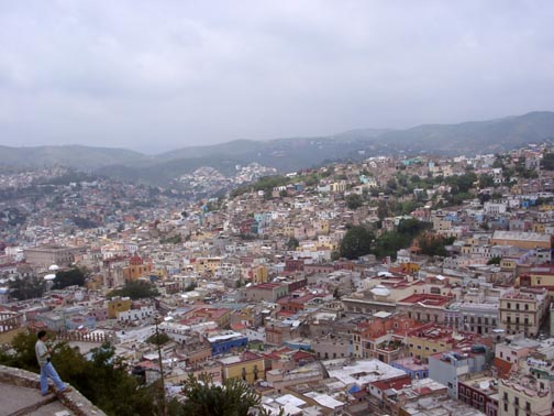 At right is Harry on the lower steps of the University of Guanajuato. The origin of the University goes back to the arrival of the Jesuits and their founding of the College of the Holy Trinity in 1732. In 1828 it became the property of the Government of the State and was renamed the State College. In 1945 it gained university status. This impressive neoclassical style building, made of green stone, currently houses the Rector's Office and administrative and academic offices, as well as a number of the University's schools and faculties. We visited the Don Quixote museum; we climbed the hundreds of steps up to the statue of El Pipila. The Pipila monument was erected in 1939. The rose colored sculpture is in honor of Juan Jose de los Reyes Martinez. "El Pipila," as he came to be known, was the hero of the struggle for Mexican Independence. By setting fire to the portal of the Alhondiga de Granaditas (the grainery) with a torch, he made it possible to take the building on September 28, 1810. Following is a picture taken from the hill where the monument is located, looking down on the city. (Click on the thumbnail.) Notice the man standing at the edge of the terrace, lower left, to gain perspective of the height. |