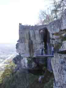 We left Houston on 10/27/01. The only "have to" was that we reached Nashville by the morning of Nov. 3rd, where Harry would attend a seminar for the week end. We spent the first night at a motel in Tuscaloosa, Alabama. The weather was cold, probably below freezing. The next day, 10/28, as we got into Tennessee we started seeing the many signs urging us to see ROCK CITY. This is advertised as being naturally formed "streets and avenues." In 1936 the owner began a barn roof advertising campaign to lure vacationers from the highways. By the 1950s, "See Rock City" was painted on 900 barn roofs from Michigan to Texas. There were indeed some huge rocks and interesting views - but much of the "attraction" was also man-made. We later found that the hikes we did in the mountains later (for free, or a dollar or two parking fee at the trailhead) were much more enjoyable. (Fewer people, too - we value our solitude.) One point at Rock City claimed visitors could view 7 states from there - and had a sign pointing the way. Picture on the right - Arrows point the way: 1/2 mile to TN; 120 miles to KY, VA; 50 miles to NC; 80 miles to SC; unreported mileage to GA but it's close; and 25 miles to AL. Click for more pictures and information about Lookout Mountain and Rock City |