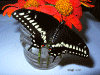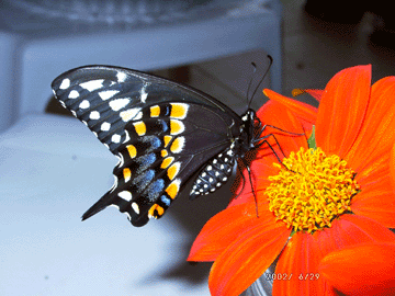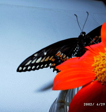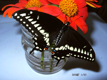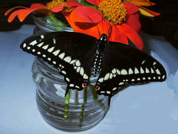 This is a male, I think. They don't have as much blue on the bottom part of the upper surface of the wing. We put him on flowers in a vase while his wings dried. We set the vase on the front porch, and before long, he flew away to share his beauty with others. Isn't he BEAUTIFUL??? Watching this