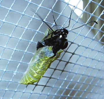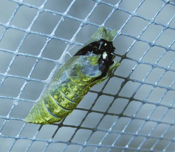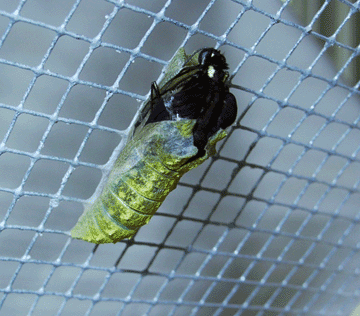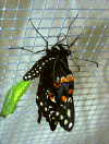 Saturday morning, 6/29/02 - The first of our seven hatched out! Left to right, the butterfly is emerging from the chrysalis. |