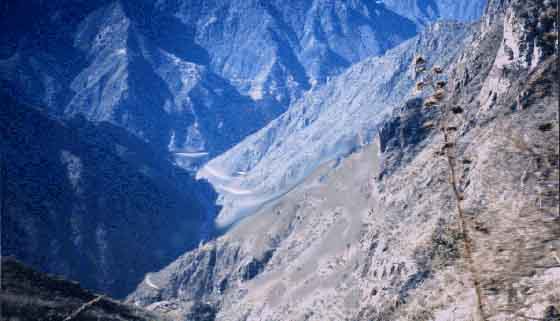 The bus trip to the bottom of the canyon takes seven or eight hours. Batopilas (population 1,150) occupies one single, narrow street along the river with towering canyon walls rearing up in all directions. Temperatures are some 30 degrees warmer than at the top of the canyon and you find that forests of cactus have replaced stands of pine. With near tropical weather in the winter, the summer months are said to be almost unbearably hot and humid. (In the picture you can barely see the white streaks, which are the switchbacks of the road that we would eventually reach on our downward journey.)