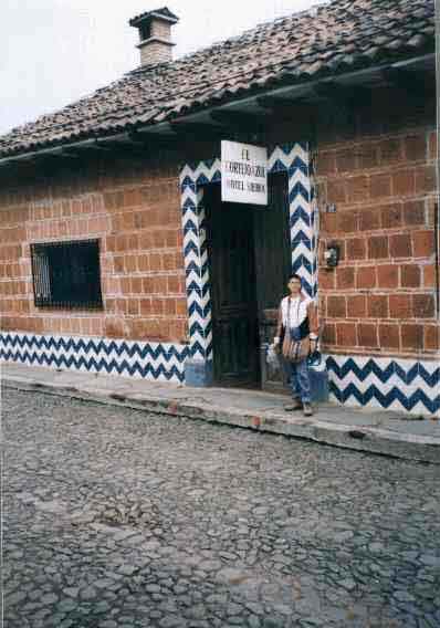 We left Ajijic and headed along the south side of Lake Chapala for Mazamitla, a beautiful resort town in the mountain zone of the state of Jalisco. The trip was only about 60 miles, but over a twisting, turning road through the mountains to about 7,000 feet elevation. First we visited a very fancy hotel outside of town (Monteverde - we didn't even ask the price), and walked through the beautiful grounds with a profusion of flowers. Then we headed back into town to look for a place to stay. We chose the hotel Cortijo Azul - 120 pesos, or about $13! That was for both of us - not each. (To see a picture of the outside of the hotel, click HERE.)