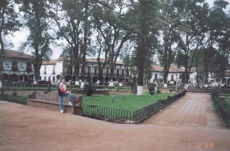 We took a bus to the Eduardo Rúiz National Park, located within the city of Uruapan. Inside the park is the origin of the Cupatitzio River (which means "singing river"). There were cobblestone paths through magnificent vegetation, flowers, trees, rivers and waterfalls. During the afternoon we had to take cover from a heavy rain. Afterwards we had lunch at the Plaza Urani in the park, which had wonderful, inexpensive food. We each had sauteed chicken breast with lots of garlic, fried potatoes, guacamole, tortillas, and the most wonderful hot chipotle salsa. (We bought some to bring back.) We were also served the best freshly prepared pineapple juice I'd ever tasted. (To see a picture of me in the Parque, click HERE.)