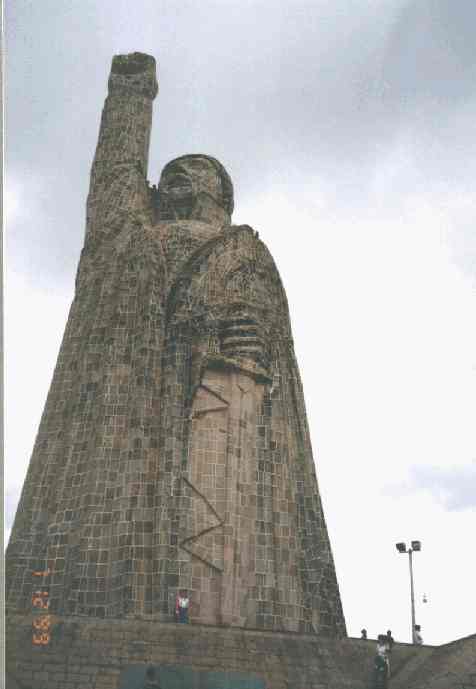 Pátzcuaro is known for its lake, one of the world's highest at 7,250 feet. We took a 20-minute boat ride across Lake Pátzcuaro to Juanitzio Island. There are no cars on the island. Steep stairs wind around and up to the top of the hill which forms the island, and along the route are continuous open-air shops and restaurants. At the very top is a commanding 131-foot statue of Don José Maria Morelos y Pavón, a hero of the Revolution; inside the statue visitors can climb a circular stairway to the top and view murals of scenes from the hero's life. (To see a picture as we approached the island, click HERE. For a picture of the huge statue, click HERE. To get an idea of the size, reference me standing at the base - you can barely see the white front of my jacket.)